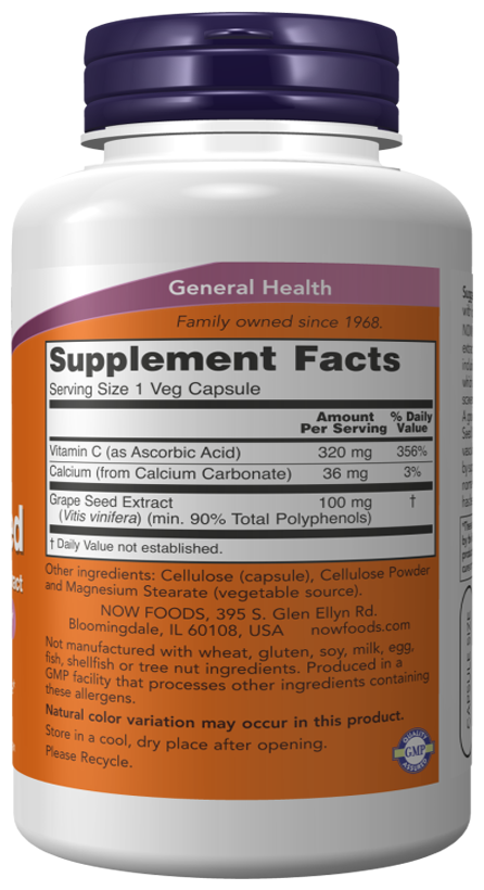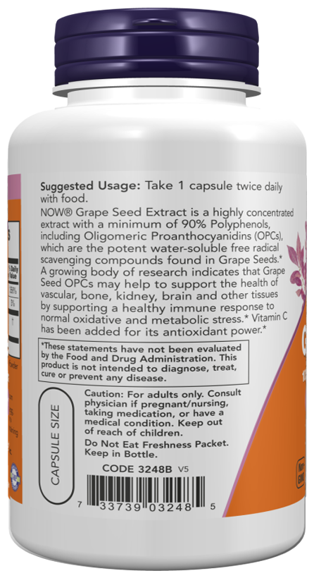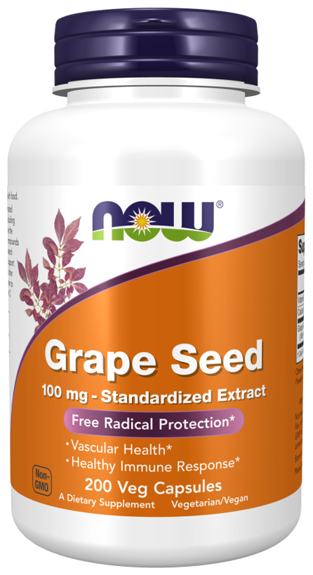 Экстракт виноградных косточек от NOW - это высококонцентрированный экстракт, содержащий как минимум 90% полифенолов, в том числе олигомерные проантоцианидины (OPC), полезные водорастворимые сложные соединения, которые нейтрализуют свободные радикалы. В природном виде они содержатся в виноградных косточках. В результате целого ряда исследований было обнаружено, что экстракт виноградных косточек и OPC могут поддерживать здоровье сердечно-сосудистой системы, костей, почек, мозга и других тканей организма.