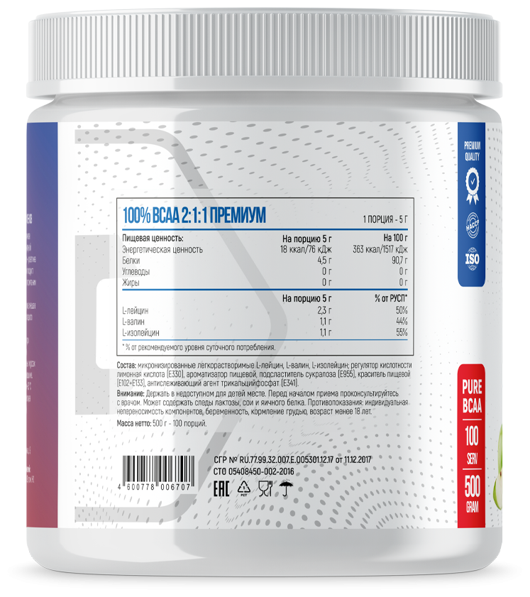 микронизированные легкорастворимые L-лейцин, L-валин, L-изолейцин; регулятор кислотности лимонная кислота (E330), ароматизатор пищевой, подсластитель сукралоза (E955), краситель натуральный (E160а), антислеживающий агент трикальцийфосфат (E341).