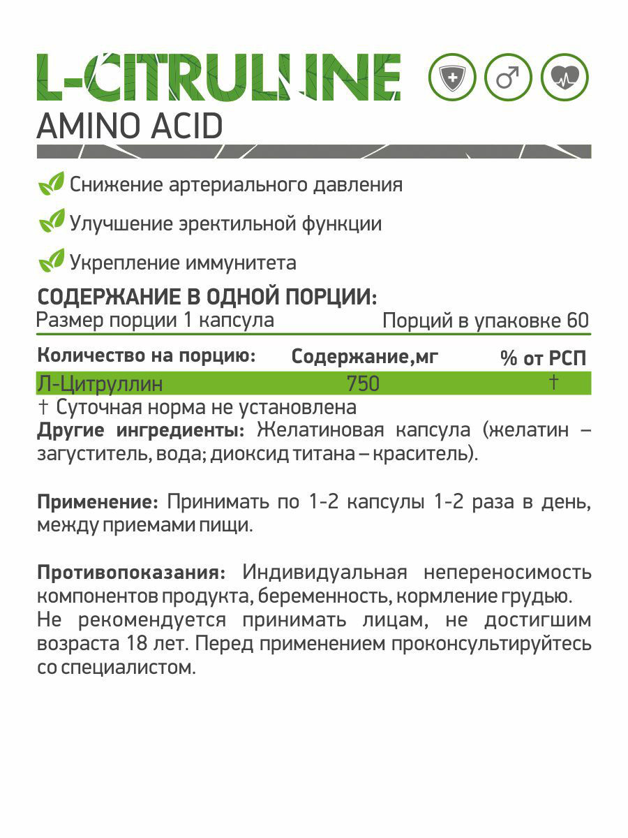 Добавка эффективна при переутомлении, синдроме хронической усталости, в период реабилитации после перенесенных заболеваний, а также для поддержания мышечной активности и более быстрого восстановления после интенсивных нагрузок. L-цитруллин способствует нормализации обмена веществ в целом.