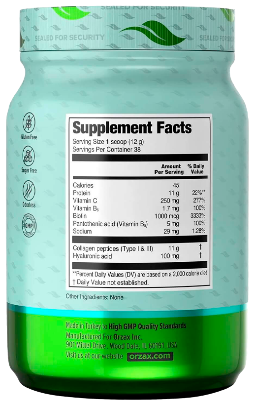 Добавка содержит в себе пептид коллагена 1 и 2 типов, которые максимально легко и эффективно усваивается организмом. Это позволяет быстро восстанавливать достаточный уровень содержания компонента в организме. Дополнительно в состав входят вспомогательные элементы: