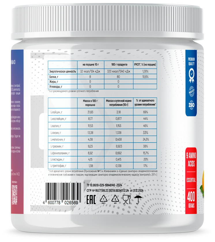 EAA (L-лейцин; L-лизин; L-валин; L-изолейцин; L-треонин; L-фенилаланин; L-гистидин; L-метионин; L-триптофан), подсолнечный лецитин - антиокислитель (E322), лимонная кислота - регулятор кислотности (E330), ароматизатор пищевой «Персик», ароматизатор пищевой «Карамель»,  краситель сахарный колер IV (E150d), сукралоза - подсластитель (E955), агент антислеживающий орто-фосфат кальция 3-замещенный (E341ii), краситель пищевой каротин (E160a).