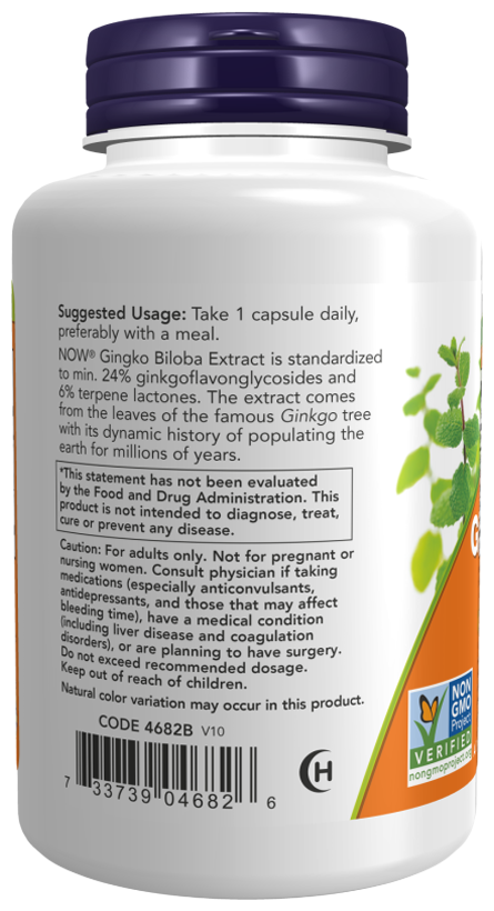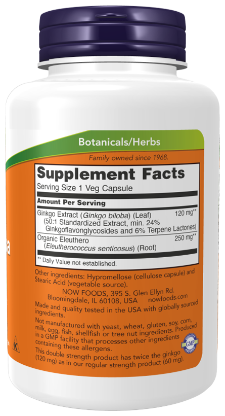 Ginkgo Biloba Double Strength содержит в своей формуле 24% стандартизованного экстракта, что делает препарат вдовое сильнее и повышает скорость его воздействия. Основная задача Гинкго Билоба двойная сила от Now Foods - это замедление процесса старения организма. Ведь не секрет, что свободные радикалы, которые образуются в результате обменных процессов и ряда внешних факторов пагубно воздействуют на клетки. Это приводит к целому ряду заболеваний, включая Альцгеймер и Паркинсон.